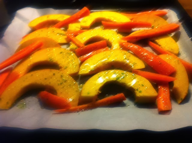 Paahda 180asteisessa uunissa kunnes kurpitsa ja porkkanat ovat pehmenneet, noin 40 minuuttia.